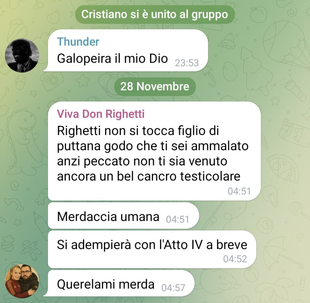 Nei messaggi comparsi sul gruppo, gli autori hanno espresso auguri di malattie mortali, riferimenti all’auspicio che Violi possa contrarre patologie oncologiche, e formule intimidatorie che evocano una “prossima azione ostile” premeditata. Si tratta di contenuti la cui violenza verbale raggiunge un livello aberrante, che non lascia spazio ad alcuna interpretazione diversa dalla minaccia grave e dalla sistematica persecuzione personale.